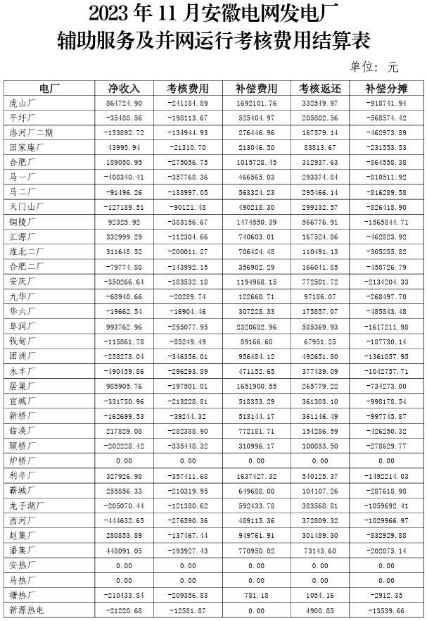 根據華東區(qū)域“兩個細則”規(guī)則要求,國網安徽省電力有限公司完成了2023年10-12月直調電廠并網運行考核、輔助服務補償統(tǒng)計計算,并向我局報送了并網運行考核及輔助服務補償情況。其中,吉泉直流配套跨省跨區(qū)新建火電機組調試運行期差額資金共計8882813.74元,納入12月輔助服務補償。2023年10-12月安徽電網發(fā)電廠輔助服務補償及并網運行考核費用結算表詳見附件,現予公示。如有不同意見,可于3月1日前向我局反映。