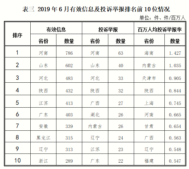 各省(自治區(qū)、直轄市)按照收到的有效信息數(shù)量排序,河南、山東、河北、陜西、江蘇等列全國前10位;按照投訴舉報數(shù)量排序,河南、山東、河北、陜西、廣西等排在全國前10位。按照百萬人均投訴舉報數(shù)量排序,海南、內(nèi)蒙古、天津、陜西、上海等排在全國前10位。(2019年6月有效信息及投訴舉報排名前10位情況見表三)