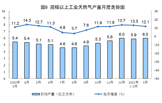 天然氣生產(chǎn)保持較快增長(zhǎng)。3月份,生產(chǎn)天然氣185億立方米,同比增長(zhǎng)12.1%,比2019年3月份增長(zhǎng)24.7%,兩年平均增長(zhǎng)11.7%,日均產(chǎn)量6.0億立方米。