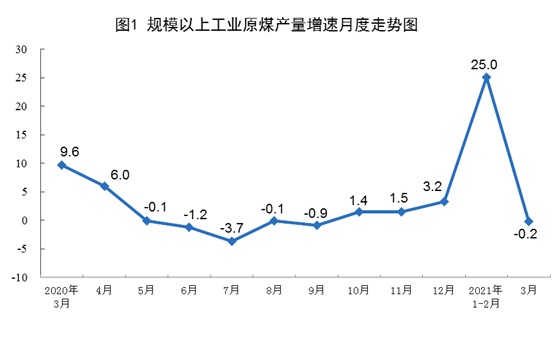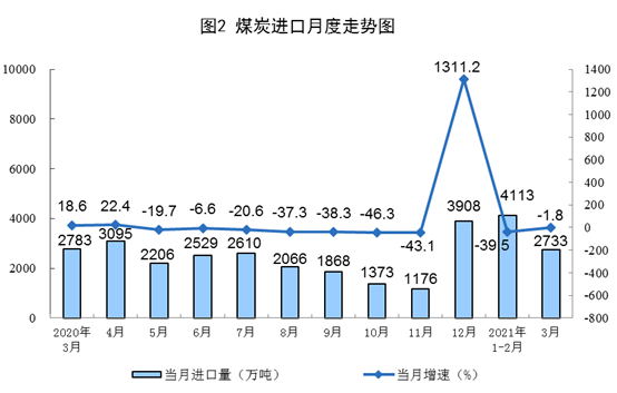 原煤生產(chǎn)小幅下降。3月份,生產(chǎn)原煤3.4億噸,同比下降0.2%,比2019年3月份增長(zhǎng)9.4%,兩年平均增長(zhǎng)4.6%,日均產(chǎn)量1099萬噸;進(jìn)口煤炭2733萬噸,同比下降1.8%。