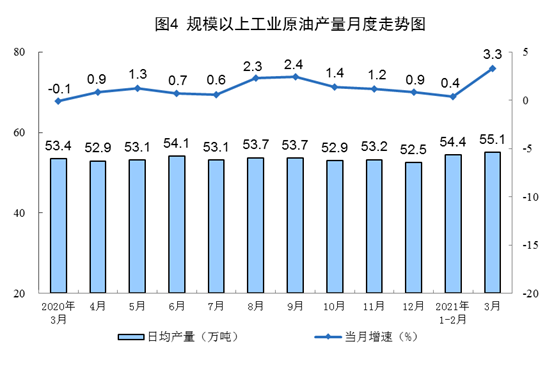 原油生產(chǎn)加快,加工量較快增長(zhǎng)。3月份,生產(chǎn)原油1709萬噸,同比增長(zhǎng)3.3%,比2019年3月份增長(zhǎng)3.3%,兩年平均增長(zhǎng)1.6%,日均產(chǎn)量55.1萬噸。加工原油5979萬噸,同比增長(zhǎng)19.7%,比2019年3月份增長(zhǎng)11.8%,兩年平均增長(zhǎng)5.8%,日均加工192.9萬噸。