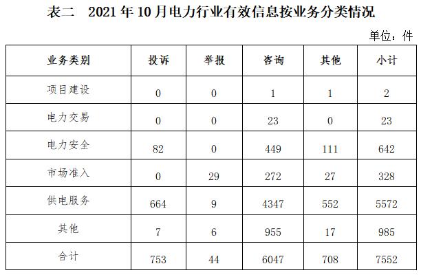 電力行業(yè)排在首位,有效信息數(shù)量為7552件,占全部有效信息的71.13%。群眾關(guān)注的內(nèi)容主要集中在故障停電、供電安全、電費(fèi)計(jì)量和收繳等方面。(2021年10月電力行業(yè)有效信息按業(yè)務(wù)分類(lèi)情況見(jiàn)表二)