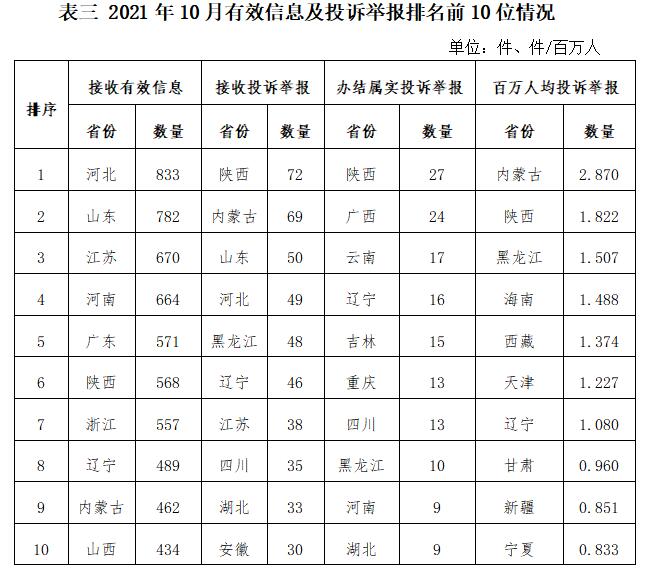 各省(自治區(qū)、直轄市)按照接收的有效信息數(shù)量排序,河北、山東、江蘇、河南、廣東、陜西、浙江、遼寧、內(nèi)蒙古、山西列全國(guó)前10位;按照接收的投訴舉報(bào)數(shù)量排序,陜西、內(nèi)蒙古、山東、河北、黑龍江、遼寧、江蘇、四川、湖北、安徽排在全國(guó)前10位;按照辦結(jié)屬實(shí)的投訴舉報(bào)數(shù)量排序,陜西、廣西、云南、遼寧、吉林、重慶、四川、黑龍江、河南、湖北排在全國(guó)前10位;按照百萬(wàn)人均投訴舉報(bào)數(shù)量排序,內(nèi)蒙古、陜西、黑龍江、海南、西藏、天津、遼寧、甘肅、新疆、寧夏排在全國(guó)前10位。(2021年10月有效信息及投訴舉報(bào)排名前10位情況見(jiàn)表三)