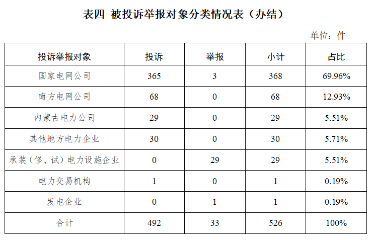 從被投訴舉報(bào)對象看,供電企業(yè)495件、占投訴舉報(bào)總數(shù)的94.10%,其中國家電網(wǎng)公司368件,占比69.96%;南方電網(wǎng)公司68件,占比12.93%;內(nèi)蒙古電力公司29件,占比5.51%;其他地方電力企業(yè)30件,占比5.71%;承裝(修、試)電力設(shè)施企業(yè)29件,占比5.51%;發(fā)電企業(yè)1件,占比0.19%;電力交易機(jī)構(gòu)1件,占比0.19%。