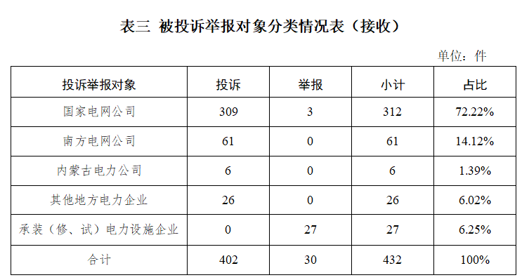 供電企業(yè)402件、占投訴舉報(bào)總數(shù)的93.75%,其中國家電網(wǎng)公司312件、占投訴舉報(bào)總數(shù)的72.22%,南方電網(wǎng)公司61件、占投訴舉報(bào)總數(shù)的14.12%,內(nèi)蒙古電力公司6件、占投訴舉報(bào)總數(shù)的1.39%,其他地方電力企業(yè)26件、占投訴舉報(bào)總數(shù)的6.02%;承裝(修、試)電力設(shè)施企業(yè)27件、占投訴舉報(bào)總數(shù)的6.25%。