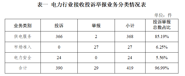 電力行業(yè)排在首位,數(shù)量為419件、占投訴舉報(bào)總數(shù)的96.99%,主要集中在供電服務(wù)、市場準(zhǔn)入、電力安全等方面。