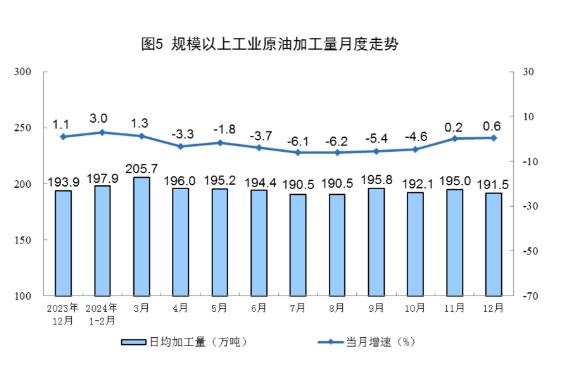 原油加工保持穩(wěn)定。12月份,規(guī)上工業(yè)原油加工量5935萬噸,同比增長0.6%,增速比11月份加快0.4個(gè)百分點(diǎn);日均加工191.5萬噸。2024年,規(guī)上工業(yè)原油加工量70843萬噸,同比下降1.6%。