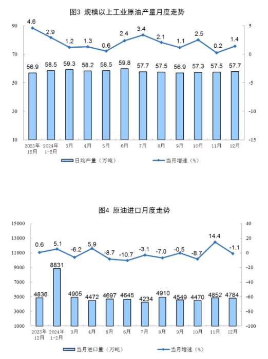 原油生產(chǎn)增速加快。12月份,規(guī)上工業(yè)原油產(chǎn)量1790萬噸,同比增長1.4%,增速比11月份加快1.2個(gè)百分點(diǎn);日均產(chǎn)量57.7萬噸。進(jìn)口原油4784萬噸,同比下降1.1%。