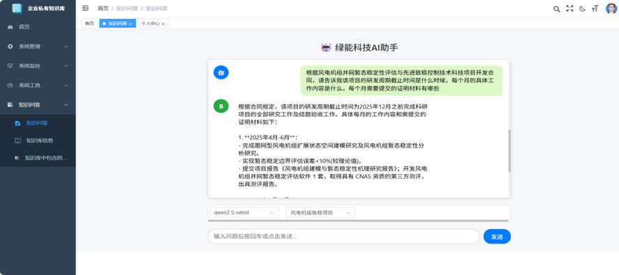 秉持“讓數(shù)據(jù)多跑路、員工少跑腿”理念,綠能科技利用開源大模型平臺自主部署本地化企業(yè)私有知識庫智能問答系統(tǒng),并在內(nèi)部投入試運行。知識庫整合海量技術(shù)文檔、科技項目管理文檔、制度文件等材料,通過智能語義檢索提供精準的工作指引與政策解讀,員工可隨時通過系統(tǒng)獲取標準化操作規(guī)范,信息查詢效率提升70%,有效消除重復溝通和無效勞動。此外,綠能科技自主開發(fā)的報表輔助助手先后在生產(chǎn)運營中心、電力交易中心投入運行。報表輔助助手運用自動化算法替代傳統(tǒng)人工數(shù)據(jù)收集、整理與合并,實現(xiàn)一鍵自動生成報表,報表處理時效提升90%,從根本上減輕基層員工報表壓力,將人力從低效重復勞動中解放出來。