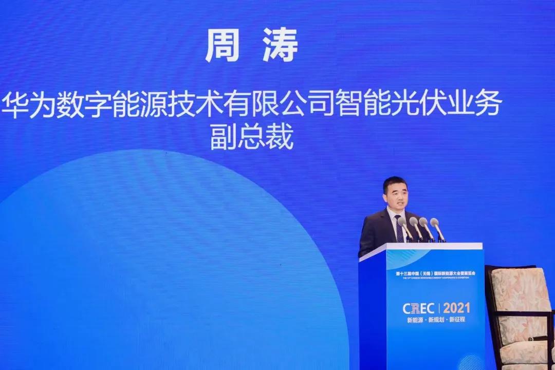 在4日下午本次大會主論壇“2021全球新能源產(chǎn)業(yè)峰會”上,華為數(shù)字能源技術(shù)有限公司智能光伏業(yè)務(wù)副總裁周濤帶來了《光儲融合,全面智能 打造面向未來的智能光儲系統(tǒng),助力構(gòu)建新型電力系統(tǒng)》的主題演講。演講以構(gòu)建新能源為主體的新型電力系統(tǒng)出發(fā),圍繞碳達(dá)峰、碳中和能源行業(yè)革命,詳細(xì)介紹了華為數(shù)字能源技術(shù)在改善電網(wǎng)和提高光伏、儲能上的產(chǎn)品和技術(shù)應(yīng)用,展現(xiàn)了華為智能光伏解決方案的創(chuàng)新和引領(lǐng)作用。