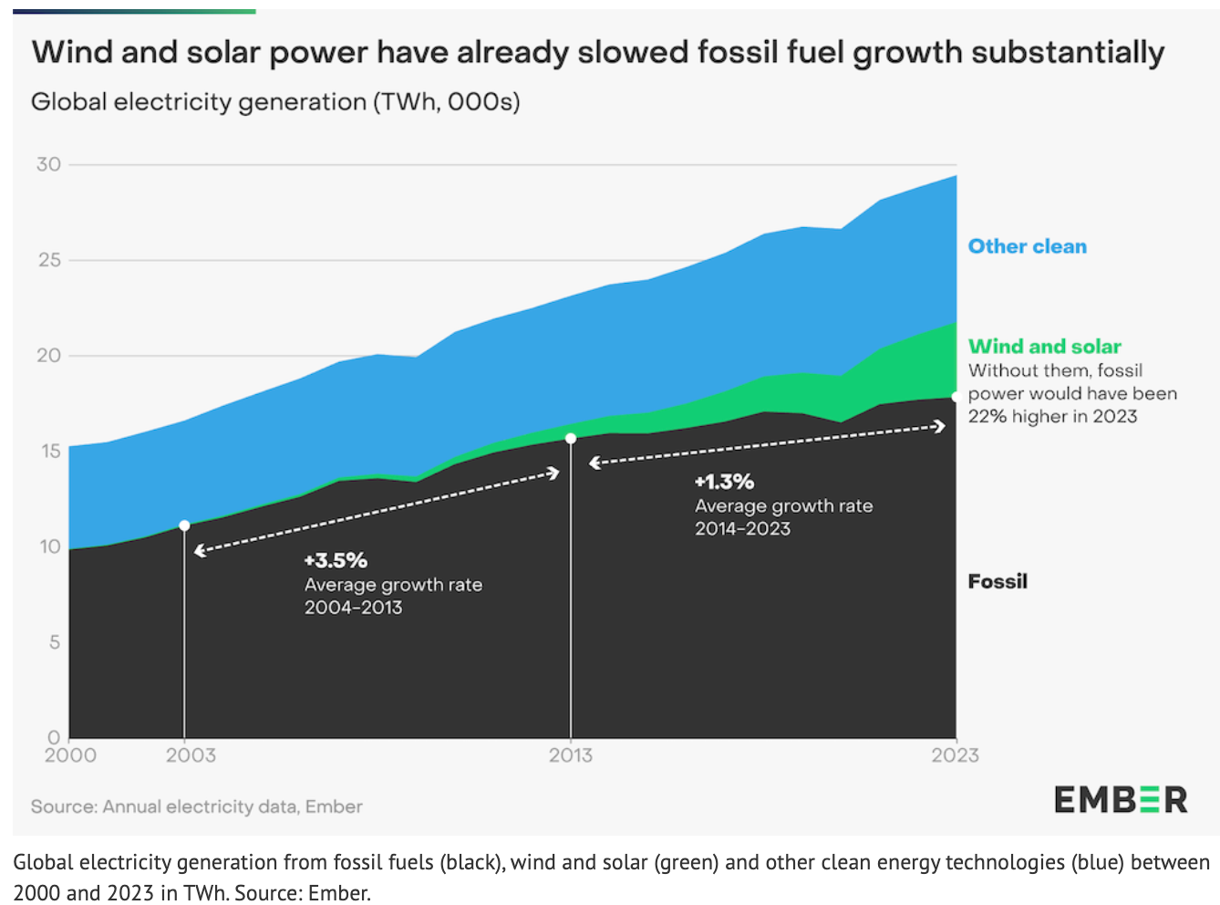 在全球范圍內(nèi),風能和太陽能現(xiàn)在的增長速度已經(jīng)足以超過不斷增長的電力需求,這意味著從2024年起,全球化石燃料發(fā)電量和排放量將達到峰值。因此,化石燃料發(fā)電量下降的新時代即將到來。2023年可再生能源滿足了創(chuàng)紀錄的30%的全球電力需求,如果不是這一年水力發(fā)電的創(chuàng)紀錄下降,2023年排放量可能已經(jīng)達到峰值。風能和太陽能的崛起阻礙了化石燃料發(fā)電的增長,如果沒有風能和太陽能,2023年化石燃料發(fā)電將增長22%,本會使全球年排放量增加約40億噸二氧化碳。