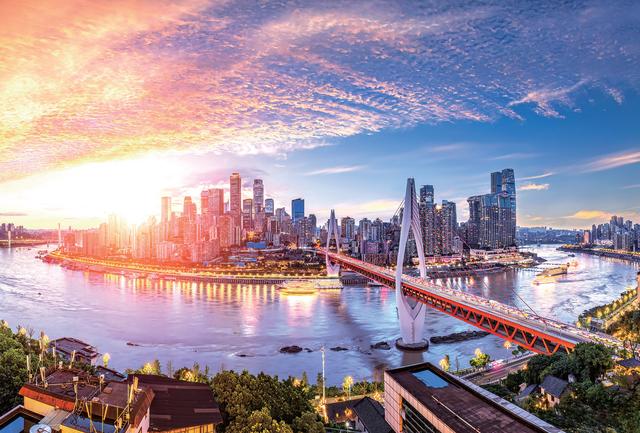 重慶,穿城而過(guò)的長(zhǎng)江在夕陽(yáng)下波光粼粼、五彩斑斕