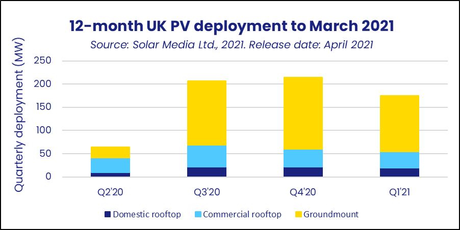 截止到3月底的12個月中,英國新增并網(wǎng)太陽能發(fā)電容量660兆瓦。根據(jù)英國太陽能協(xié)會數(shù)據(jù),預(yù)計2021年,全國新增安裝量可能達到1,000兆瓦,因為在三個主要市場,即住宅,商業(yè)屋頂和地面安裝市場均實現(xiàn)增長。