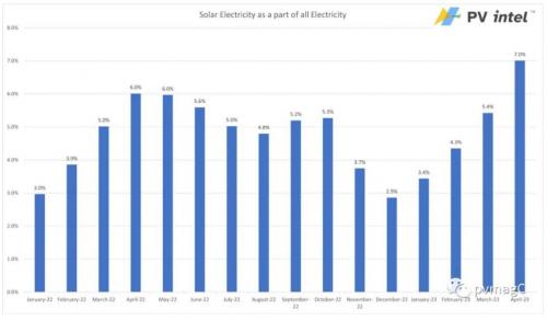 美國能源部能源信息署(EIA)發(fā)布了最新的月度電力報(bào)告,提供了截至4月底的數(shù)據(jù)。最新數(shù)據(jù)顯示,與去年4月相比,太陽能發(fā)電量增長了16.6%,占當(dāng)月美國總發(fā)電量的7%多一點(diǎn),高于2022年的6%。
