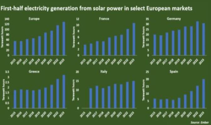 據(jù) Ember(Ember是一個(gè)獨(dú)立能源智庫(kù),旨在通過數(shù)據(jù)和分析,推動(dòng)世界向清潔電力轉(zhuǎn)型。) 稱,今年上半年歐洲太陽(yáng)能發(fā)電量較 2022年同期,增長(zhǎng)了近 11%,達(dá)到創(chuàng)紀(jì)錄的 129.2 太瓦時(shí)。