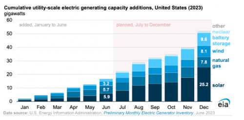 天然氣發(fā)電占2023年上半年美國新增產(chǎn)能的34%(5.7吉瓦),僅次于太陽能。2023年上半年并網(wǎng)的兩個(gè)最大項(xiàng)目是天然氣發(fā)電廠:俄亥俄州的1836兆瓦Guernsey發(fā)電站和伊利諾伊州的1214兆瓦CPV Three Rivers能源中心。