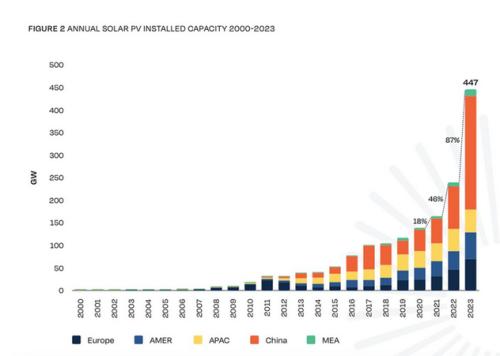 根據(jù)這份報告的分析,全球在2023年新增的光伏系統(tǒng)裝機容量為447GW,而2022年安裝的光伏系統(tǒng)的裝機容量為239GW,同比增長87%。這一增長速度自從2010年以來前所未有,2010年全球安裝的光伏系統(tǒng)裝機容量僅為目前的4%。