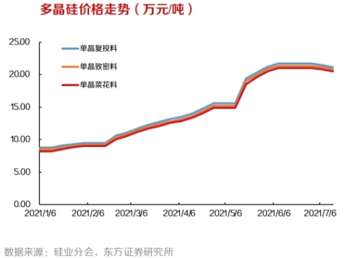 或許是在大擴產(chǎn)的預期下,近期硅料普遍價格由大漲轉向松動。根據(jù)硅業(yè)分會數(shù)據(jù),上周國內(nèi)單晶復投料成交均價下滑至 20.81 萬元/噸,周環(huán)比降幅為 1.61%;單晶致密料成交均價下滑至 20.6 萬元/噸,周環(huán)比降幅為 1.06%;單晶菜花料成交均價下滑至 20.35 萬元/噸,周環(huán)比降幅 0.73%。