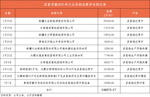 與此同時,國內(nèi)多晶硅還原爐市占率第一、該細分領域絕對龍頭的雙良節(jié)能也受益頗豐(還原爐是生產(chǎn)多晶硅的重要設備),近三年來累計為行業(yè)各家硅料企業(yè)提供三百多臺大型高效還原爐。據(jù)公告統(tǒng)計,2021年以來公司已簽訂的多晶硅還原爐項目已高達15.02億元,相比2020全年多晶硅還原爐系統(tǒng)實現(xiàn)的1.77億元收入,大幅增長748.59%。