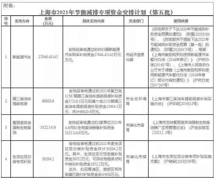 1、按照《財(cái)政部關(guān)于下達(dá)2020年節(jié)能減排補(bǔ)助資金預(yù)算的通知》(財(cái)建[2020]164號(hào))、《財(cái)政部關(guān)于提前下達(dá)2021年節(jié)能減排補(bǔ)助資金預(yù)算(第一批)的通知》(財(cái)建[2020]473號(hào)),根據(jù)《上海市鼓勵(lì)購(gòu)買和使用新能源汽車暫行辦法(2016年修訂)》(滬府辦發(fā)[2016]7號(hào))、《上海市人民政府辦公廳關(guān)于調(diào)整〈上海市鼓勵(lì)購(gòu)買和使用新能源汽車暫行辦法(2016年修訂)部分內(nèi)容的通知〉》(滬府辦發(fā)[2017]41號(hào))等規(guī)定,安排經(jīng)審核通過的6903輛新能源汽車購(gòu)車補(bǔ)貼資金27948.43145萬元。