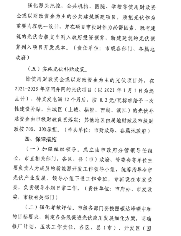 文件提到:除使用財政資金或以財政資金為主的光伏項目外,在2021-2025年期間并網(wǎng)的光伏項目(以2021年1月1日為起點(diǎn)計),待其發(fā)電滿12個月后,按0.2元/瓦標(biāo)準(zhǔn)給予一次性建設(shè)補(bǔ)貼。主城區(qū)(上城、拱墅、西湖、濱江)的光伏補(bǔ)貼資金由市級財政負(fù)責(zé)落實(shí);其他地區(qū)由屬地財政及市級財政按70%、30%承擔(dān)。(牽頭單位:市財政局、各屬地政府)