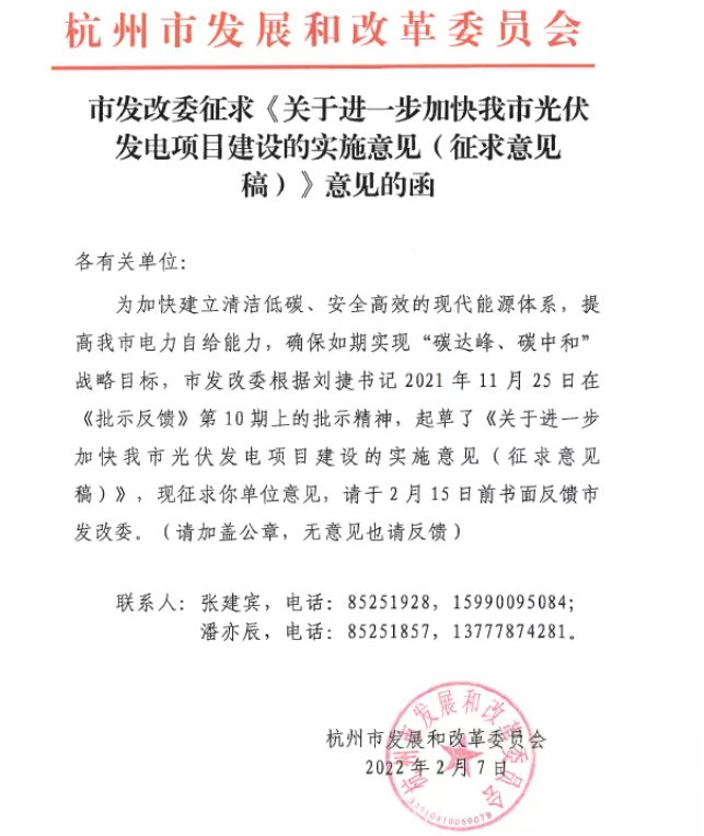 近日,杭州市發(fā)改委發(fā)布了一則關(guān)于征求《關(guān)于進(jìn)一步加快我市光伏發(fā)電建設(shè)的實(shí)施意見(征求意見稿)》意見的函。