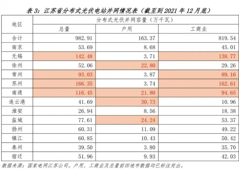 從表 3 還可以看出,江蘇戶用光伏市場(chǎng)發(fā)展較好的是蘇北地區(qū),江蘇戶用光伏裝 機(jī)規(guī)模前三的地市是連云港、鹽城和徐州,三市戶用光伏裝機(jī)約占江蘇省戶用光 伏裝機(jī)的一半。