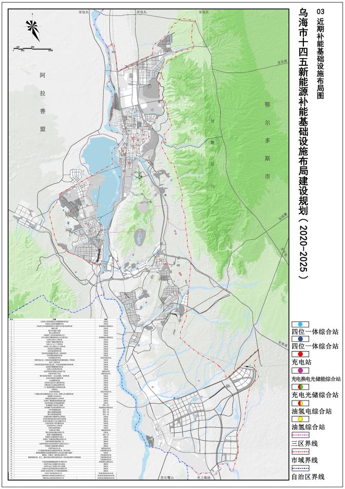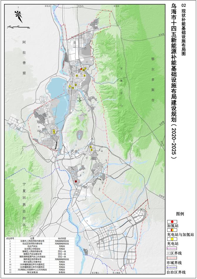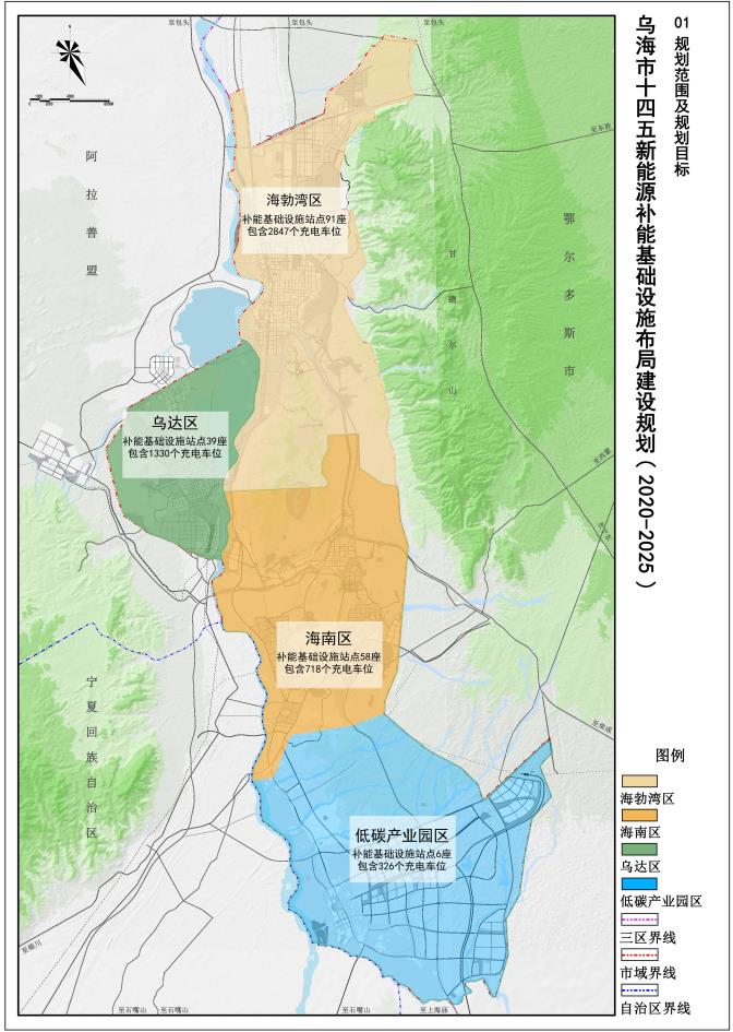 規(guī)劃范圍為全烏海市域范圍,總面積1754平方公里,主要涉及濱河新區(qū)、 海勃灣中心城區(qū)、烏達(dá)中心城區(qū)、海南中心城區(qū)和工業(yè)園區(qū)、物流園區(qū)內(nèi)的充電樁布局、換電站布局、加氫站布局和光伏儲(chǔ)能一體化設(shè)施布局。
