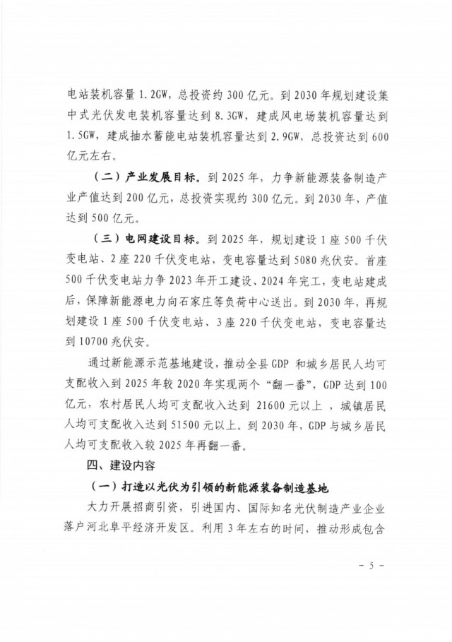 三、原則同意《河北阜平太行山新能源發(fā)展示范基地實(shí)施方案》提出的新能源開(kāi)發(fā)目標(biāo),到2025年規(guī)劃建設(shè)集中式光伏6.3GW、風(fēng)電1.5GW、抽水蓄能1.2GW,2030年在此基礎(chǔ)上進(jìn)一步實(shí)現(xiàn)高質(zhì)量跨越式發(fā)展。