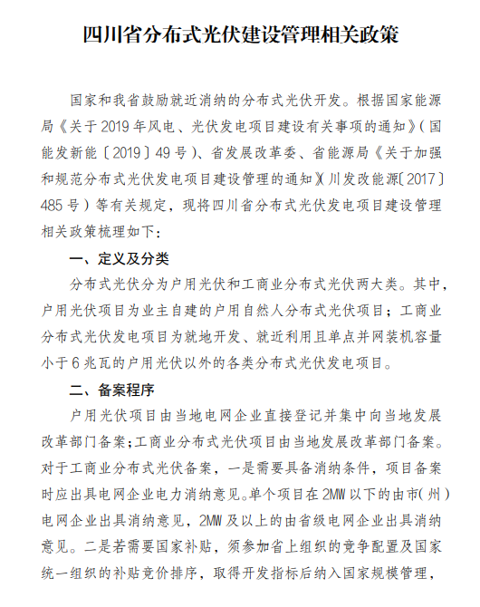 11月17日,四川省綿陽市發(fā)改委發(fā)布《四川省分布式光伏建設管理相關政策》,對分布式光伏進行了明確的定義及分列,明確了項目備案流程及補貼情況。