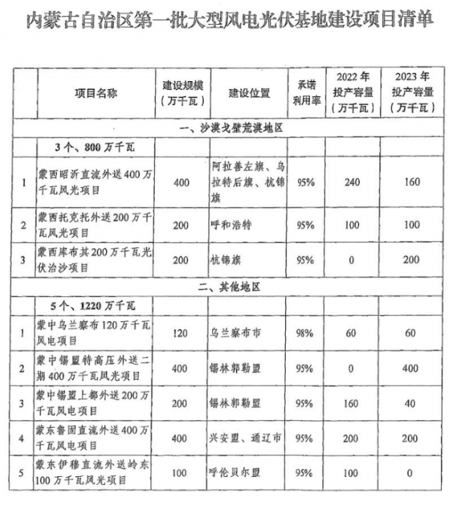 根據(jù)此前公開信息顯示,第一批風光大基地總規(guī)模約97.05GW(《總規(guī)模97.05GW!第一批大型風、光大基地項目名單發(fā)布》),主要布局在內(nèi)蒙、青海、甘肅等19個省份,包括2GW魯北鹽堿灘基地、2.6GW廣西橫州基地、青海海南、海西10.9GW基地、陜五一期6GW外送基地、渭南3.53GW基地、內(nèi)蒙古2GW光伏治沙……等等均已悉數(shù)開工。其中,內(nèi)蒙古第一批8個國家大型風電光伏基地項目共計2020萬千瓦。