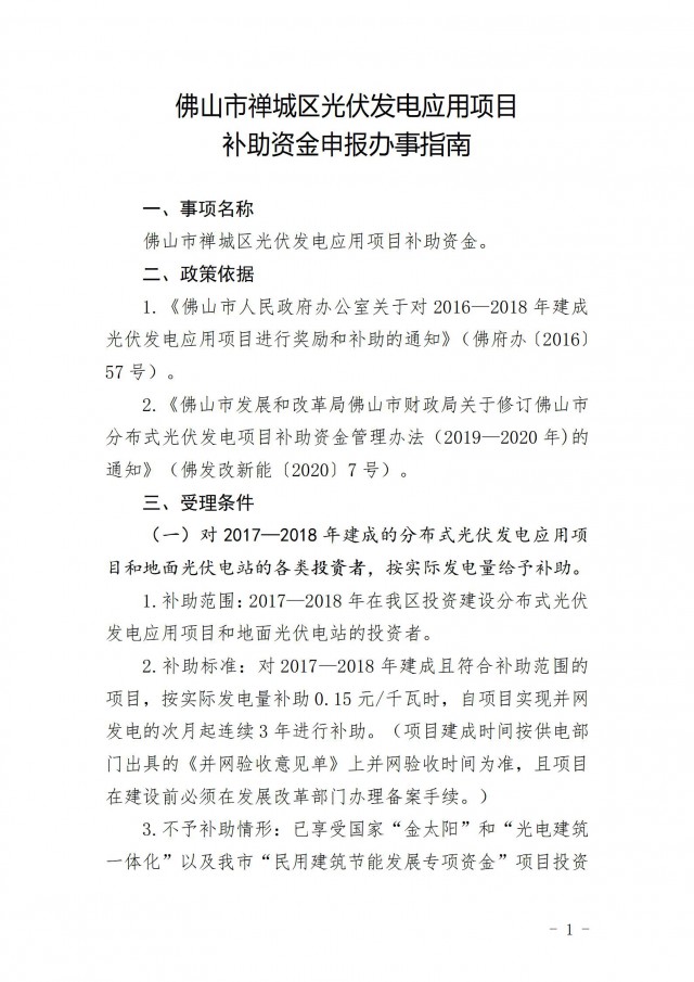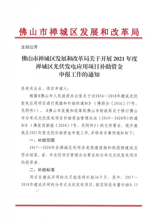 近日,佛山市禪城區(qū)發(fā)展和改革局印發(fā)《關(guān)于開展2021年度禪城區(qū)光伏發(fā)電應(yīng)用項日補(bǔ)助資金申報工作的通知》。