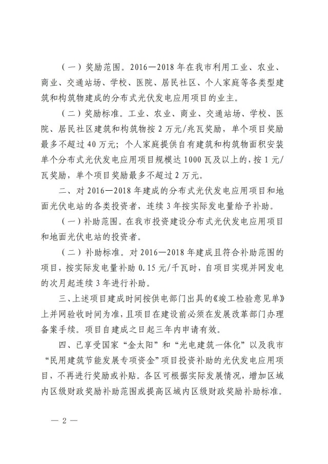 項目自建成并網(wǎng)的次月起連續(xù)補(bǔ)助36個月,其中:2017一2018年建成并網(wǎng)的分布式光伏發(fā)電項目,按實際發(fā)電量補(bǔ)助0.15元/千瓦時;2019-2020年建成并網(wǎng)的分布式光伏發(fā)電項目,按實際發(fā)電量補(bǔ)助0.3元/千瓦時。
