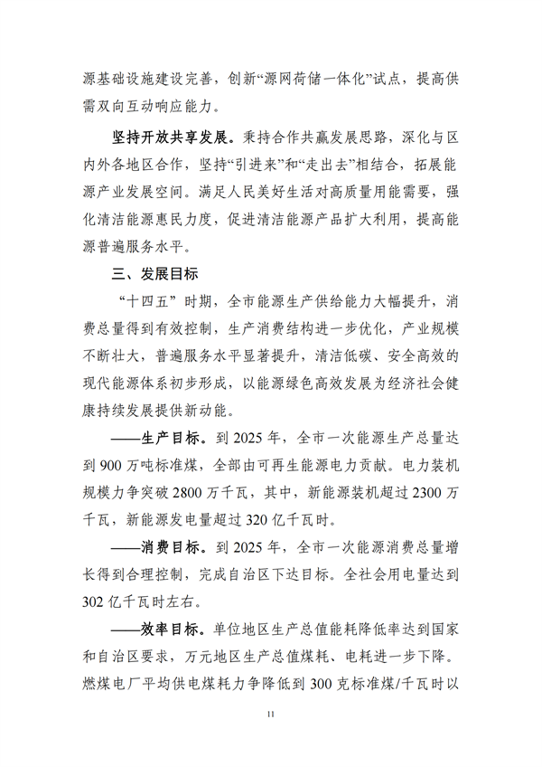 生產(chǎn)目標(biāo):到2025年,全市一次能源生產(chǎn)總量達(dá)到900萬噸標(biāo)準(zhǔn)煤,全部由可再生能源電力貢獻(xiàn)。電力裝機(jī)規(guī)模力爭突破2800萬千瓦,其中,新能源裝機(jī)超過2300萬千瓦,新能源發(fā)電量超過320億千瓦時(shí)。