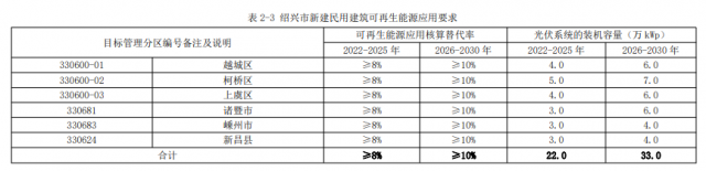 12月26日,紹興市建設(shè)局公示《紹興市綠色建筑專項(xiàng)規(guī)劃(2022-2030)(草案)》,其中提到,新建民用建筑(農(nóng)民自建住宅除外),應(yīng)當(dāng)按照國家和省有關(guān)標(biāo)準(zhǔn)利用可再生能源??稍偕茉蠢迷O(shè)施應(yīng)當(dāng)與建筑主體一體化設(shè)計(jì),同步施工、同步驗(yàn)收。新建民用建筑應(yīng)采用可再生能源系統(tǒng),應(yīng)配置太陽能系統(tǒng),滿足浙江省工程建設(shè)標(biāo)準(zhǔn)《民用建筑可再生能源應(yīng)用核算標(biāo)準(zhǔn)》的要求。 至2025 年,紹興市各縣(市、區(qū))新建民用建筑可再生能源應(yīng)用核算替代率達(dá)到 8%,太陽能光伏系統(tǒng)的裝機(jī)容量達(dá)到 22.0 萬 kWp。至 2030 年,紹興市各縣(市、區(qū))新建民用建筑可再生能源應(yīng)用核算替代率達(dá)到 10%,太陽能光伏系統(tǒng)的裝機(jī)容量達(dá)到 33.0 萬 kWp。
