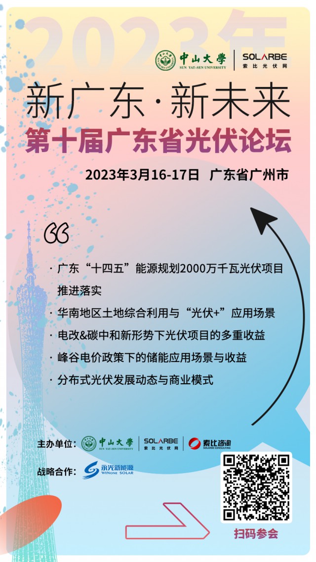 新廣東 新未來!第十屆廣東省光伏論壇 3月16-17日 聚首廣州,為時(shí)代籌謀!分布式光伏重心南遷之際與各位同仁一起搶占先機(jī)、贏得主動(dòng)!趕緊點(diǎn)擊了解詳情報(bào)名吧!