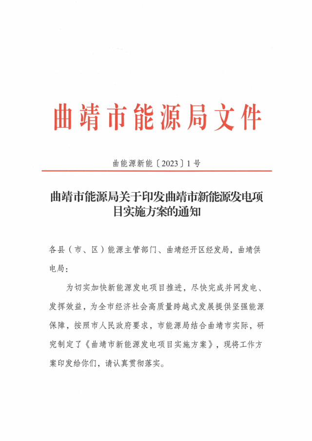 2月8日,曲靖市能源局關于印發(fā)曲靖市新能源發(fā)電項目實施方案的通知。通知顯示,為切實加快新能源發(fā)電項目推進,盡快完成并網發(fā)電、發(fā)揮效益,曲靖市全力推進全市總裝機976.1萬千瓦、總投資523.53億元的75個在建風電、光伏項目建設,確保2023年完成并網350萬千瓦,完成投資100億元。
