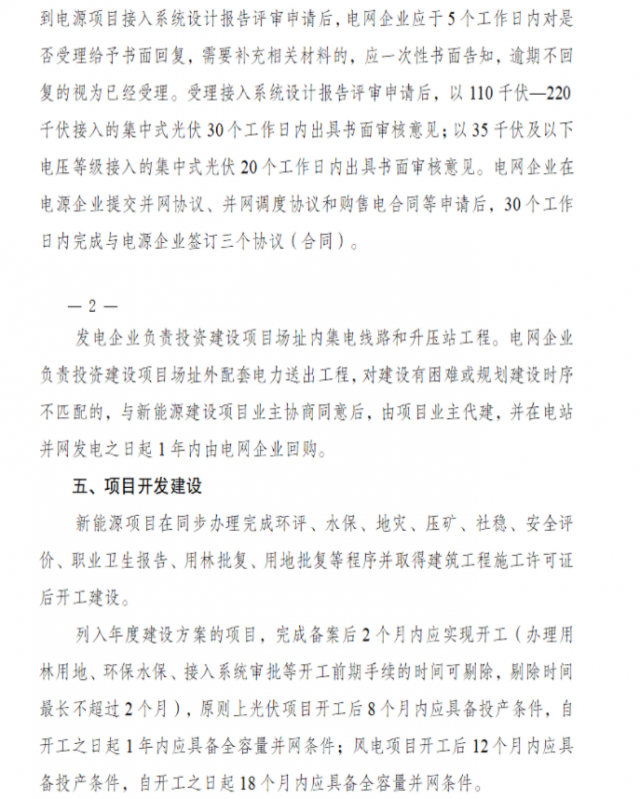 列入年度建設(shè)方案的項(xiàng)目,完成備案后2個(gè)月內(nèi)應(yīng)實(shí)現(xiàn)開工(辦理用林用地、環(huán)保水保、接入系統(tǒng)審批等開工前期手續(xù)的時(shí)間可剔除,剔除時(shí)間最長不超過2個(gè)月),原則上光伏項(xiàng)目開工后8個(gè)月內(nèi)應(yīng)具備投產(chǎn)條件,自開工之日起1年內(nèi)應(yīng)具備全容量并網(wǎng)條件;風(fēng)電項(xiàng)目開工后12個(gè)月內(nèi)應(yīng)具備投產(chǎn)條件,自開工之日起18個(gè)月內(nèi)應(yīng)具備全容量并網(wǎng)條件。
