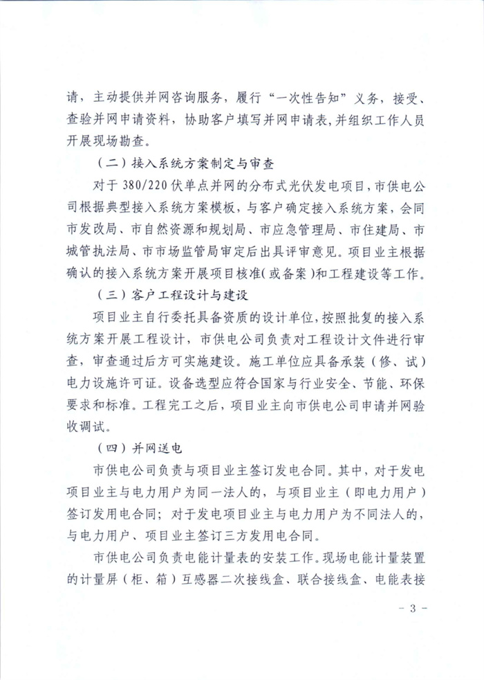 并網(wǎng)方面,則是對于380/220伏單點并網(wǎng)的分布式光伏發(fā)電項目,市供電公司根據(jù)典型接入系統(tǒng)方案模板,與客戶確定接入系統(tǒng)方案,會同市發(fā)改局、市自然資源和規(guī)劃局、市應(yīng)急管理局、市住建局、市城管執(zhí)法局、市市場監(jiān)管局審定后出具評審意見。項目業(yè)主根據(jù)確認的接入系統(tǒng)方案開展項目核準(zhǔn)(或備案)和工程建設(shè)等工作。