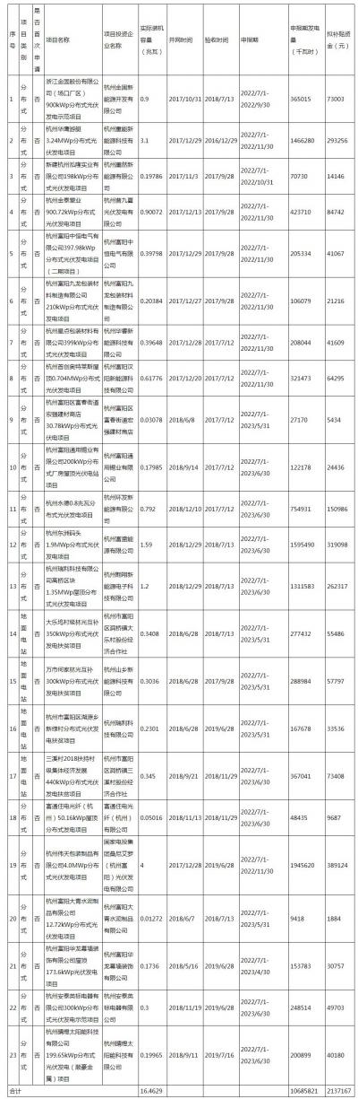 根據(jù)區(qū)經(jīng)濟(jì)和信息化局、區(qū)財(cái)政局《關(guān)于太陽(yáng)能光伏發(fā)電資助的實(shí)施細(xì)則》(富經(jīng)信財(cái)〔2018〕10號(hào),富財(cái)企〔2018〕428號(hào)),《杭州市富陽(yáng)區(qū)人民政府關(guān)于深入實(shí)施高新工業(yè)強(qiáng)區(qū)戰(zhàn)略的若干意見(jiàn)(試行)》(富政〔2018〕4號(hào))及區(qū)政府文件處理單2020年第501號(hào)之規(guī)定,我區(qū)組織開(kāi)展2023年富陽(yáng)區(qū)非居民光伏發(fā)電項(xiàng)目區(qū)級(jí)補(bǔ)貼兌現(xiàn)工作。經(jīng)區(qū)經(jīng)信局會(huì)同區(qū)財(cái)政局、區(qū)供電公司等相關(guān)部門審核,我區(qū)23家企業(yè)的23個(gè)項(xiàng)目符合補(bǔ)貼條件,擬補(bǔ)貼資金2137167元,詳見(jiàn)附表?,F(xiàn)予以公示,歡迎社會(huì)各界進(jìn)行監(jiān)督。