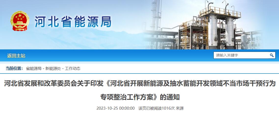 10月25日,河北省發(fā)展和改革委員會發(fā)布關(guān)于印發(fā)《河北省開展新能源及抽水蓄能開發(fā)領(lǐng)域不當市場干預(yù)行為專項整治工作方案》(以下簡稱《方案》)的通知。