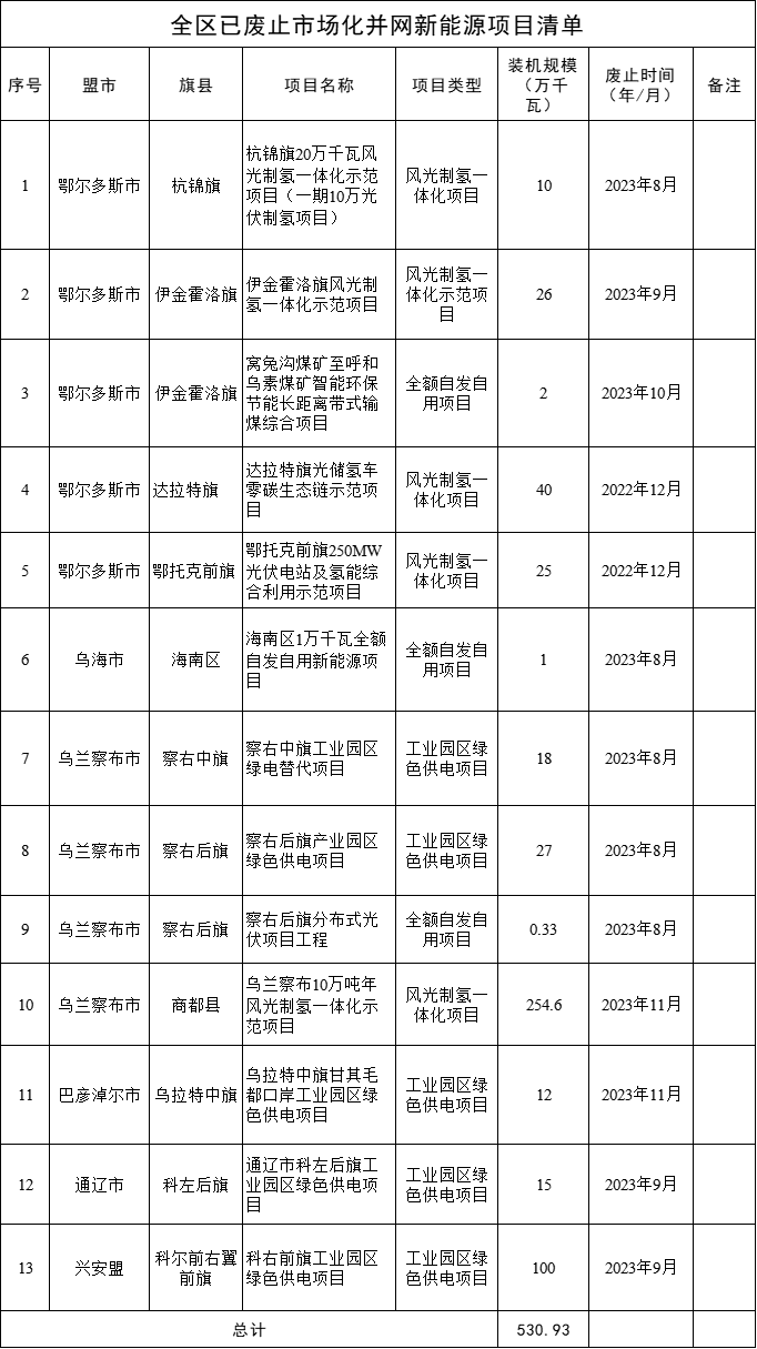 12月4日,內(nèi)蒙古自治區(qū)能源局對各盟市已廢止的市場化并網(wǎng)新能源項目進(jìn)行了公告,合計13個項目,涉及裝機規(guī)模超530萬千瓦,項目清單如下: