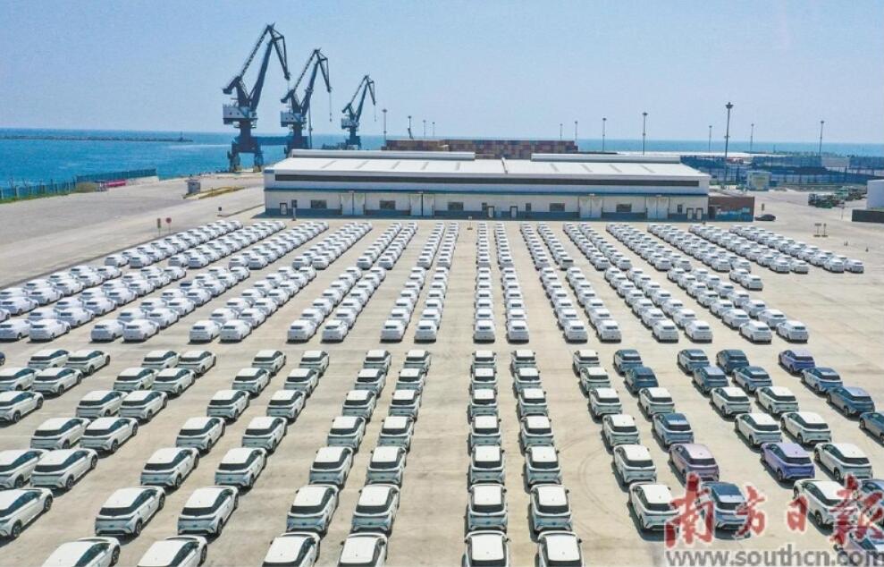 新三樣”出口保持高位增長。圖為待出口的新能源汽車停放在小漠國際物流港。南方日?qǐng)?bào)記者 朱洪波攝