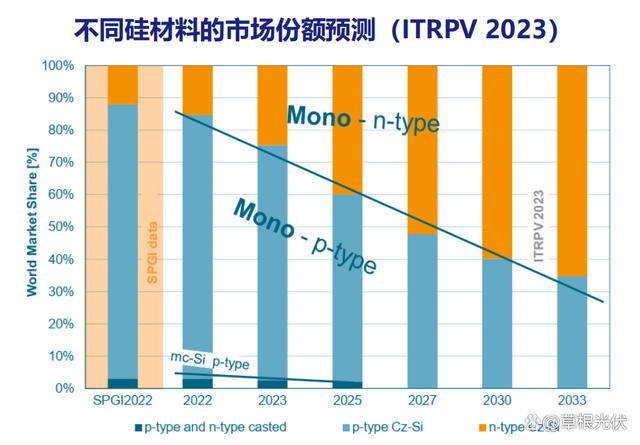于是在包括晶澳在內(nèi)的頭部企業(yè)紛紛布局之下,n型產(chǎn)能迎來了迅速提升。據(jù)PV InfoLink預(yù)估,2023年底TOPCon名義產(chǎn)能將有望超過600GW,組件出貨有望達(dá)到約120GW上下的水平。明年上半年預(yù)計(jì)將有400GW-500GW產(chǎn)能投向市場(chǎng)。中期看,ITRPV預(yù)測(cè),到2033年n型產(chǎn)能市場(chǎng)占比有望達(dá)到60%,成為市場(chǎng)主流技術(shù)。