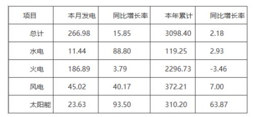 (一)發(fā)電量情況。11月份當月,全省發(fā)電量266.98億千瓦時,同比增加15.85%。其中水電11.44億千瓦時,同比增加88.80%;火電186.89億千瓦時,同比增加3.79%;風電45.02億千瓦時,同比增加40.17%;太陽能23.63億千瓦時,同比增加93.50%。
