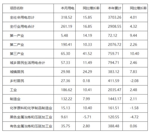(一)全社會用電量情況。全省全社會用電量318.52億千瓦時,同比增加15.85%;累計用電量3703.26億千瓦時,同比增加4.01%。