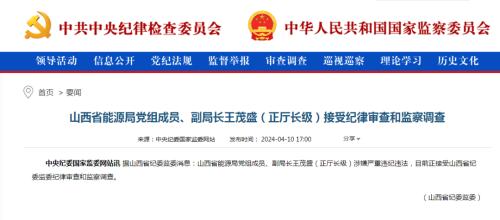 4月10日,中央紀(jì)委國家監(jiān)委網(wǎng)站發(fā)文,據(jù)山西省紀(jì)委監(jiān)委消息:山西省能源局黨組成員、副局長王茂盛(正廳長級)涉嫌嚴(yán)重違紀(jì)違法,目前正接受山西省紀(jì)委監(jiān)委紀(jì)律審查和監(jiān)察調(diào)查。