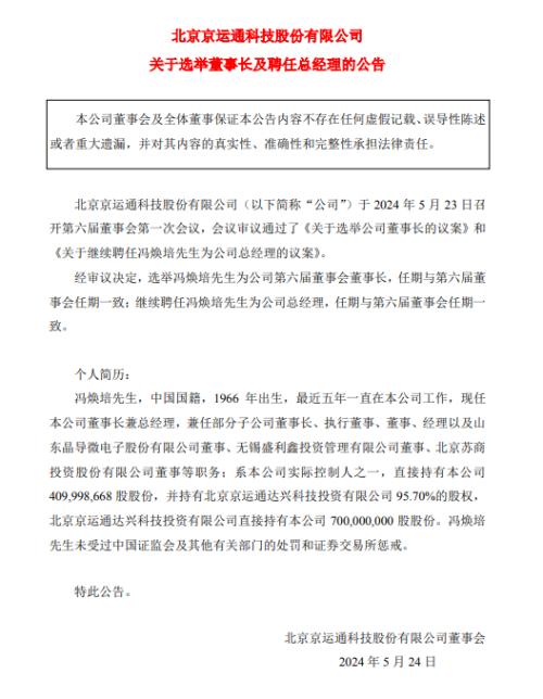 馮煥培繼續(xù)擔(dān)任京運通董事長、總經(jīng)理!