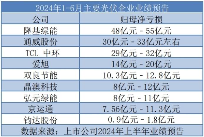 據(jù)多家光伏企業(yè)發(fā)布的業(yè)績預(yù)告,2024年上半年,光伏行業(yè)普遍面臨盈利壓力。隆基綠能、通威股份、TCL中環(huán)等9家光伏企業(yè)預(yù)計(jì)合計(jì)虧損超過188億元,其中隆基綠能預(yù)計(jì)虧損48億元至55億元,通威股份預(yù)計(jì)虧損30億元至33億元。這一數(shù)字令人觸目驚心,也反映了當(dāng)前光伏行業(yè)面臨的嚴(yán)峻形勢。