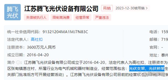 值得一提的是,騰飛光伏于2023年年底被注銷生產資格,旗下工廠也進入停產狀態(tài),員工被原地解散。截止今年4月,騰飛光伏在企查查顯示的狀態(tài)分別為“失信被執(zhí)行人”、“嚴重違法”、“限制高消費”、“經營異常”,這樣的企業(yè)走到破產似乎并不讓人意外。